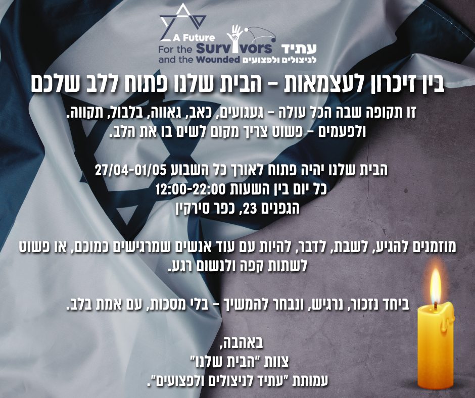 זה לא היה ערב רגיל. לא נאומים גבוהים, לא טקסים רשמיים – אלא רגעים קטנים של אמת. סביב מעגל של הקשבה וחיבוק, שורדי פוסט טראומה, מתנדבים, אנשי צוות ואורחים עצרו את המרוץ היומיומי, והקדישו שעה לנשמה. קראנו שמות, הדלקנו נרות, הקשבנו לסיפורים. חלק שיתפו, חלק שתקו – והכל היה נכון.