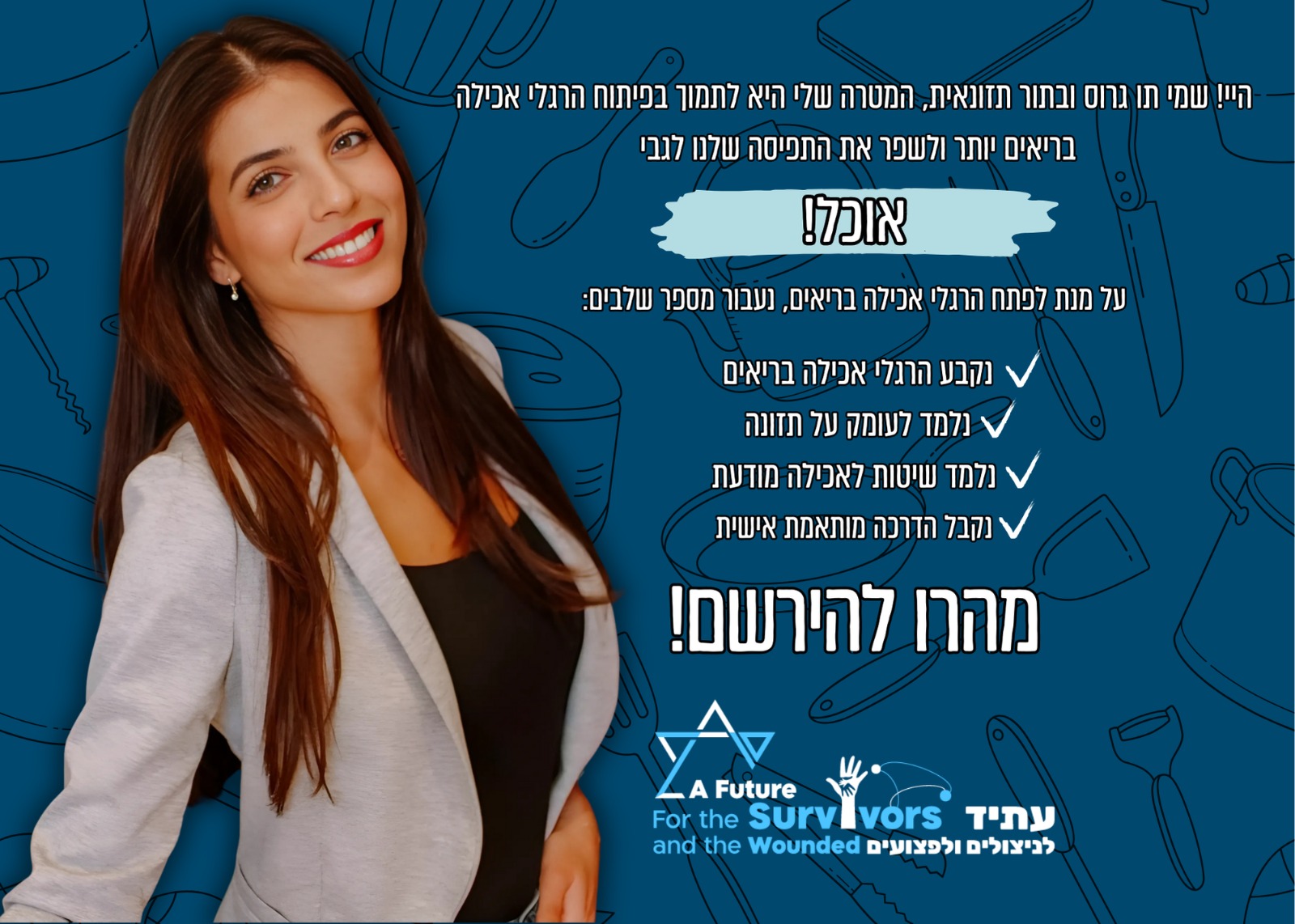 עמותת “עתיד לניצולים ולפצועים” גאה להציע שירות חדש בשיתוף עם תו גרוס, תזונאית מוסמכת ומנוסה, שמלווה אנשים בתהליך של שיקום וחזרה לאיזון פיזי ונפשי.